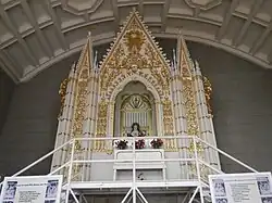The reliquary is laid open for public veneration every August 17. St. Rita of Cascia (1381) was born in the Italian town of Roccaporena. When her husband and twin sons died, she entered the Augustinian Nuns. The next 40 years of her life saw St. Rita devoting herself to a life of prayer and works and deeds of charity as dictated by the rules of St Augustine. At age 60, while meditating before the cross, a wound seeming afflicted by a thorn appeared on her forehead. St. Rita began boring the sign of stigmatization which is considered being one with Jesus. Because of the stigmata, she suffered in pain for the next 15 years which she courageously accepted. St. Rita died on May 22, 1457. Her intact and incorrupt body is kept and honored in the shrine at her hometown on Cascia, Italy.[28][29][30][31]