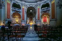 Under Pope Clement XII, the architect Carlo de Dominicis created the current baroque church which was completed in 1735.[11] The main altarpiece is a Christ in Glory by Pompeo Batoni and commissioned by Cardinal Giuseppe Furietti.[8] This present building has been described as "...one of the loveliest Baroque interiors in the city [of Rome]"[12] and "a fine example of eighteenth-century art".[12]