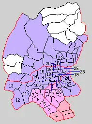 * yellow - areas formerly within the district borders during the early Meiji period