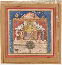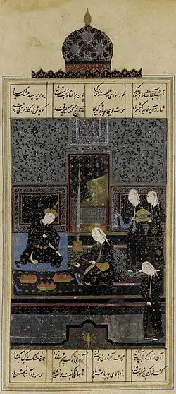 Bahram V is a great favourite in Persian literature and poetry. This illustration (mid-16th-century, Safavid era) to the Persian poet Nizami's epic poem Haft Peykar depicts Bahram and an Indian princess.