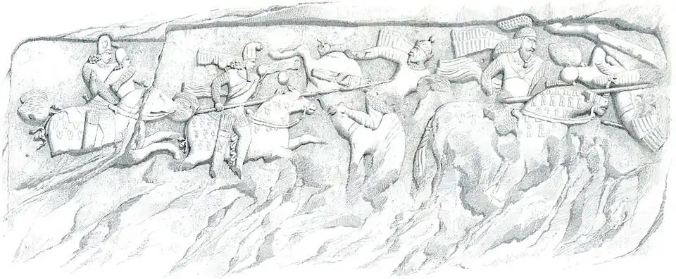 Rock-face relief at Naqsh-e Rostam of Persian emperor Shapur I (on horseback) capturing Roman emperor Valerian (standing) and Philip the Arab (kneeling), suing for peace, following the victory at Edessa.