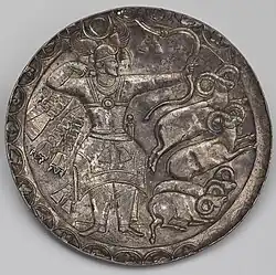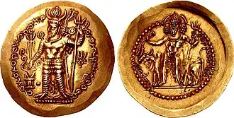 From around 370, however, towards the end of the reign of Shapur II, the Sasanians lost the control of Bactria to invaders from the north: first the Kidarites, then the Hephthalites and finally the Alchon Huns, who would follow up with an invasion of India.[52] These invaders initially issued coins based on Sasanian designs.[53] Various coins minted in Bactria and based on Sasanian designs are extant, often with busts imitating Sassanian kings Shapur II (r. 309 to 379) and Shapur III (r. 383 to 388), adding the Alchon Tamgha and the name "Alchono" in Bactrian script on the obverse, and with attendants to a fire altar on the reverse.[54]