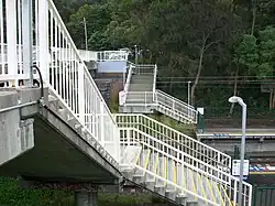 A set of modern concrete stairs accessing the south end of Platform 2 from the First Street overbridge.[3]
