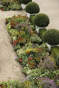 In the south, the Untere Orangerie was added from 1711 to 1713. It is rectangular[4] and followed the model of the Versailles Orangerie.[5] The roof terrace gives a view of the Lahn valley and the parterre garden in front. The Baroque parterre was re-landscaped in the 19th century but rebuilt from 1936 to 1939 according to the original Baroque plans.[4]