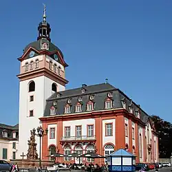 At the south end of the Obere Orangerie,[4] the town hall (Rathaus) and church (Schlosskirche) were built, and the garden terraces (Schlossgarten) were installed.[6][4] In the west, the new Rentkammer and Kanzlei were built for the administration of the county.[5]