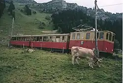 The line still operates one of its original steam locomotives, together with the four electric locomotives built for the line's electrification. A number of additional similar locomotives, together with matching coaches, were bought from the Wengernalpbahn but had (until the recent delivery of additional train sets) often returned to this line to help in winter sports traffic.[5]