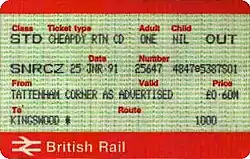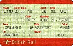 By this time, the "Day Returns Only" card could only be used to buy Cheap Day Returns, following the introduction of the "Cheap Day" fare to distinguish between peak-time and off-peak journeys. "Cheap Day Returns Only" wording began to appear on these Railcards accordingly; but they were withdrawn from 10 January 1988, with the price of the "full" Railcard being increased from £12.00 to £15.00 at the same time. The APTIS ticket issuing system had been introduced in late 1986, and was still in the process of being rolled out across the British Rail network in 1988, so the APTIS "Cheap Day Returns Only" Railcard (form number BR 4599/18) is rarely seen. The first APTIS version of the full Railcard (BR 4599/17), with mauve upper and lower bands,B also lasted until 10 January 1988,[7] at which point the following changes were made: security background (miniature repeats of the words "British Rail") was changed from the light green colour seen on most APTIS ticket stock to a dark pink; the upper and lower bands became dark brown; and part of the background was filled with the words "Senior Citizen Railcard" in cursive writing in white. This style lasted only until October 1988, at which point the white lettering changed to brown.[7][8]