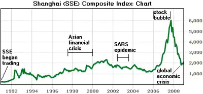 • 2007 – 2008 – A "stock market frenzy" as speculative traders rush into the market, making China's stock exchange temporarily the world's second largest in terms of turnover.[17][18] After reaching an all-time high of 6,124.044 points on October 16, 2007,[19] the benchmark Shanghai Composite Index ended 2008 down a record 65%[20] mainly due to the impact of the global economic crisis which started in mid-2008.