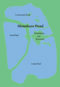 The Shinobazu Pond (不忍, Shinobazu no Ike; Japanese pronunciation: [ɕi.no.ba.(d)zɯ (no i.keꜜ)][1]) is a pond within Ueno Park (a spacious public park located in the Ueno section of Taitō, Tokyo, Japan), and a historically prominent Shitamachi feature often appearing in history and works of art. The park occupies the site of the former Kan'ei-ji, a temple closely associated with the Tokugawa shōguns, who had built it to guard Edo Castle against the northeast, a direction believed to be unlucky by traditional geomancy. The temple was destroyed during the Boshin War. The pond, although modified many times and even once drained, is natural.