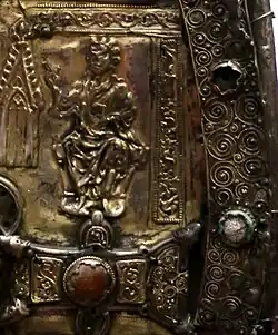 The front is dominated a first phase crossbar and a large central crystal, with smaller surrounding crystal, glass and amber settings. The figure of Christ and array of saints were added in the second phase, and are all in repoussé[18] with the finer details added by engraving and niello (a black mixture used as an inlay on engraved or etched metal) used to delineate the figures.[19] The saints are dressed like high status ecclesiastic but are shown without any of their usual symbols or emblems. They can be identified from inscriptions on the gilt-bronze strips above their heads.[1] Christ is in far higher relief than the saints. On either side of him are John the Baptist (left) and Mary (right), who are in turn flanked by two unidentified saints.[1] The surrounding between John and Christ, as well as that around the figure right of Mary are now lost. Representations of Colmcille, Benán, Brendan and the now lost figure of Brigid of Kildare on are on the lower lower register.[7][20] Patrick is positioned directly below Christ, indicating his national importance. To the left are Columba and Brendan, and to the right Benán.[1]
