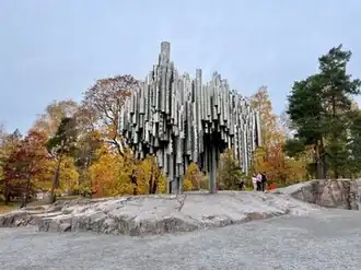 The Sibelius Monument (Finnish: Sibelius-monumentti; Swedish: Sibeliusmonumentet) by Eila Hiltunen is dedicated to the Finnish composer Jean Sibelius (1865–1957). The monument is located in Sibelius Park (Finnish: Sibeliuspuisto; Swedish: Sibeliusparken) in the Töölö district of Helsinki, Finland.