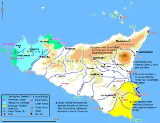 The Phoenicians had established trading posts all over the coast of Sicily after 900 BC, but had never penetrated far inland. They had traded with the Elymians, Sicani and Sicels and had ultimately withdrawn without resistance to Motya, Panormus and Soluntum in the western part of the island when the Greek colonists arrived after 750 BC.[1] These Phoenician cities remained independent until becoming part of the Carthaginian hegemony some time after 540 BC.[2]