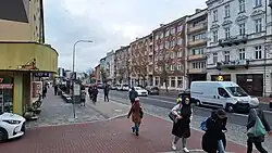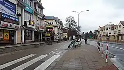 In the interwar period, the street retained its commercial character, although schools and offices appeared on it. In 1919, the Sholem Aleichem Library was opened at the Regimental Synagogue at Sienkiewicza 36.[9] It soon gained fame as one of the most important libraries in Białystok. In 1922, in the former "Grand Hotel", at no. 4 (right behind the "Astoria" restaurant), the Zeligman, Lebenhaft and Dereczynski Coeducational Gymnasium began its activity. In 1926, opposite the gymnasium, the Jewish miniature theatre "Gilarino" was established, run by W. Bubryk and the painter Oskar Rozanecki.[10] In this period the popular "Cafe Lux" was at Sienkiwicza street at no. 38. In 1927, at the end of the street, right by the market square, a triumphal arch was erected, where the Archbishop of Vilnius, Romuald Jalbrzykowski, was welcomed - when he came to inspect the construction of the St. Roch's Church. In 1930, the Office of the District Governor opened its seat at no. 27. Following the outbreak of World War II and the German occupation of Poland the Gestapo took up residence in the former building of the District Office.[11][12] In 1944, almost all of the buildings were destroyed.[13]