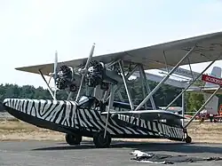 During the 1990s two reproduction S-38s were built by the late Buzz Kaplan's “Born Again Restorations,” of Owatonna, Minnesota.[13] One was produced for Samuel Curtis Johnson Jr., the son of Herbert Fisk Johnson, to recreate his father's flight, which he completed in 1998. As of August 2017 the plane is suspended from the ceiling of Fortaleza Hall in the S. C. Johnson & Son company headquarters in Racine, Wisconsin .[14] The other S-38 replica, N28V, appeared in the movie The Aviator (2004), a story loosely based on the life of Howard Hughes, who owned an S-38 during his lifetime. As of August 2017 it is owned by Kermit Weeks and located at the Fantasy of Flight Museum in Polk City, Florida, bearing the Osa's Ark paint scheme.[15][16]