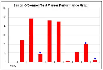 O'Donnell played as an all-rounder for Victoria in the Sheffield Shield between 1984 and 1993, scoring a century in his first match.[2] He went on to play 6 Test matches in 1985, 5 on the Ashes tour of England and one at home, but with a low bowling strike rate in 5 and 4 day cricket, he was more successful in the shorter form of the game.