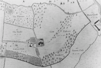 The moat around the house may have been L-shaped during this period, covering only the north and west sides of the property. Access during this time was via a wooden bridge.[3] The surrounding parkland was fenced at some point between 1410 and 1529, probably when previously common land to the west was incorporated into the park. A payment of five shillings was made annually by the Abbey to the parishes of Barton-under-Needwood and of Rolleston as compensation for the loss of pastureland. The park was probably used as a hunting ground by the abbot and deer were first recorded there in 1532.[3] The park was rented out for herbage and pannage at a rate of £8 per year by 1536.[3]