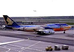 Following the spinoff of Malaysia Airlines, Singapore Airlines introduced a second-generation livery features a blue and yellow strip on the windows on the white fuselage, with the stylised bird logo in yellow.[42] The word "Singapore Airlines" was stylised in italics.