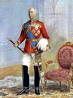 Wolseley continued at the War Office as Adjutant-General to the Forces until 1890, when he became Commander-in-Chief, Ireland.[49] He was promoted to be a field marshal on 26 May 1894,[58] and appointed by the Conservative government to succeed the Duke of Cambridge as Commander-in-Chief of the Forces on 1 November 1895.[59] This was the position to which his great experience in the field and his previous signal success at the War Office itself had fully entitled him, but it was increasingly irrelevant. Field Marshal Viscount Wolseley's powers in that office were, however, limited by a new Order in Council, and after holding the appointment for over five years, he handed over the command-in-chief to his fellow field marshal, Earl Roberts, on 3 January 1901.[18][60] He had also suffered from a serious illness in 1897, from which he never fully recovered.[49]