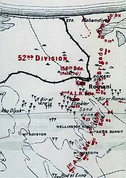 Romani defences at nightfall 3 August 1916: deployments of the 52nd (Lowland) Division's infantry brigades in a line of redoubts 1 to 11 and 21 to 23, with the 1st and 2nd Light Horse Brigades extending the line of defence towards Hod el Enna
