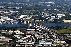 The Sir Leo Hielscher Bridges, formerly and still collectively referred to as the Gateway Bridge, are a pair of twin road bridges that carry the Gateway Motorway (M1) over the Brisbane River, skirting the eastern suburbs of the city of Brisbane. The western bridge carries traffic to the north and the eastern bridge carries traffic to the south. They are the most eastern crossings of the Brisbane River and the closest to Moreton Bay, crossing at the Quarries Reach and linking the suburbs of Eagle Farm and Murarrie. The original western bridge (formerly named the Gateway Bridge) was opened on 11 January 1986 and cost A$92 million to build.[1][3] The duplicate bridge was opened in May 2010, and cost $350 million.[1]