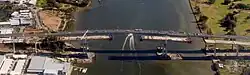 The Sir Leo Hielscher Bridges, formerly and still collectively referred to as the Gateway Bridge, are a pair of twin road bridges that carry the Gateway Motorway (M1) over the Brisbane River, skirting the eastern suburbs of the city of Brisbane. The western bridge carries traffic to the north and the eastern bridge carries traffic to the south. They are the most eastern crossings of the Brisbane River and the closest to Moreton Bay, crossing at the Quarries Reach and linking the suburbs of Eagle Farm and Murarrie. The original western bridge (formerly named the Gateway Bridge) was opened on 11 January 1986 and cost A$92 million to build.[1][3] The duplicate bridge was opened in May 2010, and cost $350 million.[1]