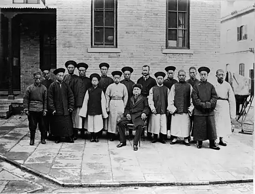 H. E. Sir Thos. Francis Wade, K.C.B., and a group of his servants photographed in the Legation compound 1879.