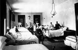 On 3 June 1848,[5] eight Sisters of Charity, Sisters Ursula Mattingly, Ann de Sales Farren, Hieronimo O'Brien, Anacaria Hoey, Clare McDurby, Mary Aloysia Lilly, Mary Eliza Dougherty, and Agatha O'Keefe,[6] arrived in Buffalo.[4] Bishop Timon had purchased an unused brick schoolhouse and adjoining cottage at Pearl Place, which he gave to the Sisters to use.[7] They outfitted it with 100 beds and living quarters for themselves.[4] On 1 October 1848, Sisters of Charity Hospital officially opened as Buffalo's first large healthcare facility, under the leadership of Sister Ursula Mattingly, DC.[5] The first patients were a group of six sailors.