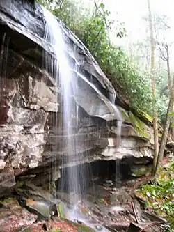 Slick Rock Falls flows on Slick Rock Creek over an overhanging bluff. The falls occasionally dries to a near-trickle, depending on the available watershed.
