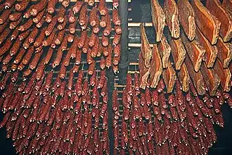 The smoking of food likely dates back to the Paleolithic era.[7][8] This process was later combined with pre-curing the food in salt or salty brine, resulting in a remarkably effective preservation process that was adapted and developed by numerous cultures around the world.[9] Until the modern era, smoking was of a more "heavy duty" nature as the main goal was to preserve the food. Large quantities of salt were used in the curing process and smoking times were quite long, sometimes involving days of exposure.[7]