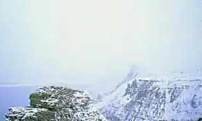 Haslum Crag is a prominent rock crag close to the island's north coast. It stands 2 nautical miles (4 km) northeast of ice-free Station Nunatak, which rises 150 m (490 ft) tall. They were first seen by members of the Swedish Antarctic Expedition (SAE), 1901–04, under Otto Nordenskiöld, and surveyed by the Falkland Islands Dependencies Survey in 1952.[8][9] Nordenskiöld named Station Nunatak because of its proximity to the expedition's winter station, and he gave Haslum Crag its original name, "Basaltspitze".[9] Concerned that "Basaltspitze" could be mistaken for descriptive information, the United Kingdom Antarctic Place-Names Committee changed it to Haslum Crag, honoring H.J. Haslum, second mate on the Antarctic, the ship of the Swedish expedition.[8] This area of the northeast coast consists of Cretaceous sedimentary rocks with abundant fossils of ammonites, gastropods, and bivalves. There are numerous basalt dikes that project up through the sedimentary rocks near the station Nunatak.[10]