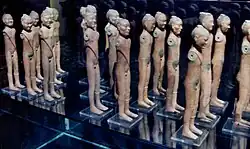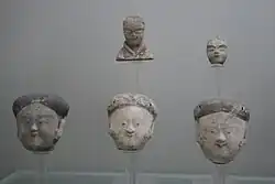 The emperor's most powerful relative was the empress dowager, widow to the previous emperor and usually the natural mother of the emperor.[6] If the grandmother of an emperor—the grand empress dowager—was still alive during his reign, she enjoyed a superior position over the empress dowager.[6] Emperors often sought the approval of the empress dowager for their decisions.[7] If an emperor was only a child, he acted merely as a figurehead while the empress dowager dominated court politics.[7] She not only had the right to issue edicts and pardons, but if the emperor died without a designated heir, she had the sole right to appoint a new emperor.[8] Below the empress dowager were the empress and imperial concubines.[8] Although she was the wife of the emperor, the empress's position at court was not secure and she could be removed by the emperor.[9] However, the empress did enjoy the submission of concubines as her subordinates, who advocated the elevation of their sons over the empress's at their own peril.[9] In the early Western Han, imperial relatives and some military officers who had served Emperor Gaozu were made kings who ruled over large semi-autonomous fiefs, but once the non-related kings had died off, an imperial edict outlawed all non-Liu family members from becoming kings.[10] The emperor's brothers, paternal cousins, brother's sons, and emperor's sons—excluding the heir apparent—were made kings.[10] The emperor's sisters and daughters were made princesses with fiefs.[11] Although the central government eventually stripped away the political power of the kings and appointed their administrative staffs, kings still had a right to collect a portion of the taxes in their territory as personal income and enjoyed a social status that ranked just below the emperor.[12] Each king had a son designated to be heir apparent, while his other sons and brothers were given the rank of marquess and ruled over small marquessates where a portion of the taxes went to their private purse.[13] Although kings and marquesses enjoyed many privileges, the imperial court was at times aggressive towards them to check their power. Starting with Emperor Gaozu's reign, thousands of noble families, including those from the royal houses of Qi, Chu, Yan, Zhao, Han, and Wei from the Warring States period, were forcibly moved to the vicinity of the capital Chang'an.[14] In the first half of Western Han, resettlement could also be imposed on powerful and wealthy officials as well as individuals who owned property worth more than a million cash.[14]