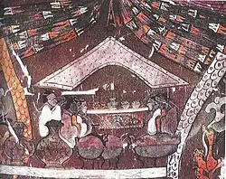 Certain occupations were traditionally reserved for women, while they were also exempted from corvée labor duties.[167] Women were expected to rear children, weave clothes for the family, and perform domestic duties such as cooking; although farming was considered men's work, sometimes women tilled fields alongside their husbands and brothers.[168] Some women formed communal spinning and weaving groups to pool resources together to pay for candles, lamp oil, and heat during night and winter.[169] A successful textile business could employ hundreds of women.[73] Singing and dancing to entertain wealthy patrons were other common professions open for women.[170] When a husband died, sometimes the widow became the sole supporter of her children, and thus had to make a living weaving silk cloths or making straw sandals to sell in the market.[171] Some women also turned to the humble profession of sorcery for income.[172] Other more fortunate women could become renowned medical physicians who provided services to the families of high officials and nobility.[173] Some wealthy women engaged in luxury trade, such as one who frequently sold pearls to a princess.[174] Some even aided in their husband's business decisions.[175] Female merchants dressed in silk clothes which rivaled even female nobles' attire were considered immoral compared to the ideal woman weaver.[175]