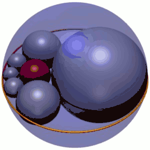 An infinite variety of hexlets may be generated by rotating the six balls s1s6 in their plane by an arbitrary angle before re-inverting them. The envelope produced by such rotations is the torus that surrounds the sphere c and is sandwiched between the two planes a and b; thus, the torus has an inner radius r and outer radius 3r. After the re-inversion, this torus becomes a Dupin cyclide (Figure 3).