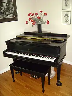 Hugo Sohmer marketed the first modern "bijou," or baby grand piano, built with a symmetrical case design which he patented in 1884.[8] "Only five feet long," these pianos were advertised as "the smallest grand ever manufactured,"[9] having "great power and volume of tone, together with the tone-sustaining quality and elastic touch heretofore only found in the concert grand."[10] The company also patented improvements in agraffe bars and actions in 1882, and in 1887 an agraffe for a quadruple strung "reverbation scale" and a pianissimo pedal in uprights, and bridge agraffes in 1890.[11]