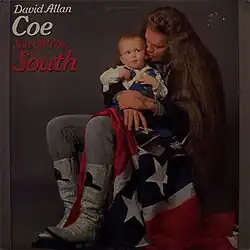 Coe's album covers had been provocative in the past, like the 1977 release Texas Moon, which displays Coe and his associates mooning the camera, and the 1978 release Family Album, which AllMusic Thom Jurek calls “one of the most bizarre covers in David Allan Coe's - hell, anybody's - catalog. He is dressed in a minister's black, flowing robe with an Amish hat, a little blonde girl in his lap, his two - yes, two (of three at one time) - wives standing behind him, and behind them, a black Lincoln Town Car and Coe's Silver Eagle tour bus. The album is dedicated to his two mothers - he's apparently from a Mormon family - and stipulates how difficult it is for a child to have two mothers. It's so surreal one is almost afraid to play the recording.”[4] The cover of Son of the South – Coe, sitting, holding a baby with a Confederate flag draped over his shoulders – was one more in a series of decisions that occasionally alienated Coe from the country mainstream, although Coe did print a message on the back of the album to diffuse any potential backlash:
