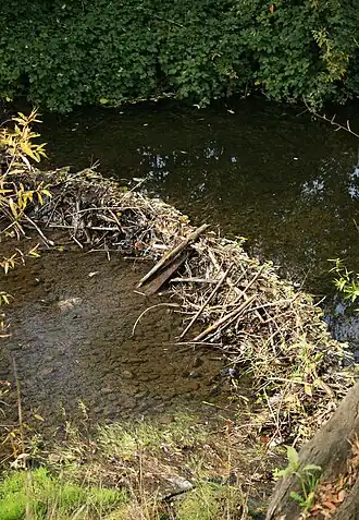 California golden beaver ("Castor canadensis subauratus") were historically abundant along Sonoma Creek but were trapped out in the California Fur Rush of the late eighteenth and early nineteenth centuries. In 1828 fur trapper Michel La Framboise travelled from the Bonaventura River to San Francisco and then the missions of San José, San Francisco Solano and San Rafael Arcángel. La Framboise stated that "the Bay of San Francisco abounds in beaver", and that he "made his best hunt in the vicinity of the missions".[7] The beaver were likely wiped out by the mid-nineteenth century but returned to Sonoma Creek, likely from the Delta, in the 1990s.[8] In 1996 a beaver family developed a taste for merlot grapevine bark in a vineyard beside the creek and were exterminated, leading to civic uproar and a shift to accommodate beaver resettlement. Sonoma Ecology Center executive director Richard Dale reports that although beavers fell trees and dam culverts, on balance they perform nearly "perfect stream restoration," because they cause the creation of deep pools, slowing the flow of flood water and enhancing fishery habitat.[9] New beavers have recolonized Sonoma Creek and are currently located in both Sonoma and Glen Ellen. A "keystone species", the beaver have created habitat that has, in turn, led to the return of river otter ("Lontra canadensis") which have been sighted recently in the beaver pond below the Boyes Boulevard bridge in Boyes Hot Springs.
