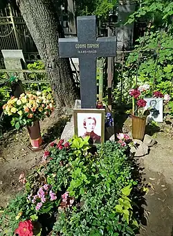 On 20 August 1933, Vedeneyeva returned to Moscow and that same day, she took the train to join Parnok and Tsuberbiller in Karinskoye.[149] The arrival was not due to Parnok's illness, but a scheduled arrival per her pre-planned itinerary.[150] On 25 August, Tsuberbiller realized that Parnok was dying and notified Erarskaya.[151] Parnok succumbed to a heart attack at 11:30 a.m. on the morning of 26 August 1933 with Tsuberbiller and Vedeneyeva at her bedside. Though she tried to make the trip from Moscow before Parnok died, Erarskaya did not arrive until around 5 p.m.[152][150] A portrait of Tsvetaeva was on her bedside table when she died.[153] The village druggist assisted Tsuberbiller in obtaining the necessary paperwork to take the body back to Moscow, after the funeral service in Karinskoye. Her funeral procession on 28 August with her friends and fans extended 75 kilometers outside of Moscow. They did not reach the city until the following day.[154][150] She was buried in Vvedenskoye Cemetery in Olga Tsuberbiller's family plot.[150][155]