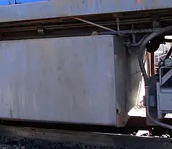 To be usable on the iron ore line, Class 34-000 locomotives which ended up working there were modified to a similar fuel capacity. The inter-bogie linkage was removed and the fuel tank was enlarged by changing it from saddle-shaped to rectangular box-shaped. To maintain its lateral balance, a slab of metal was attached to each bogie in place of the removed linkage. In the second picture, the weld lines on the end of the enlarged fuel tank as well as the metal slab at the end of the bogie are visible.[8]