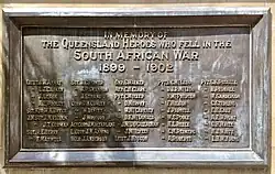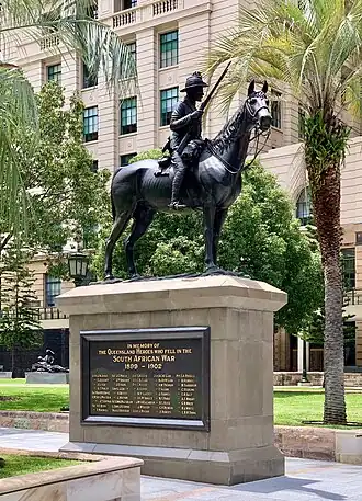 The first overseas conflict in which colonial Queensland troops were involved occurred during Second Boer War (1899–1902) in South Africa. The Queensland Government despatched volunteer contingents of mounted infantrymen to the war to aid the forces of the British Commonwealth involved in the armed intervention. Eighty-nine Queenslanders died during the war. In the years after the war a public committee was established to erect a memorial to the fallen, but the funds raised were insufficient and the project lapsed.[1]