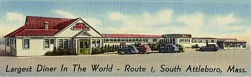 For several decades starting in the 1920s, South Attleboro was known for Wightman's Diner on Boston Post Road (aka Washington Street, or U.S. Route 1).[3][4] The diner started out as a lunch wagon in 1923, and expanded by connecting multiple lunch cars by the Worcester Lunch Car Company and Jerry O'Mahony Diner Company.[4] By the 1930s, it advertised itself locally as the "largest diner in the world."[4] In addition, its Old Mexico Room offered fine foods and liquors, a dance floor surface, and floor show.[4] The diner closed in 1946.[3] By the 1960s, the location was occupied by Almac's market and later Yankee Spirits.[4]