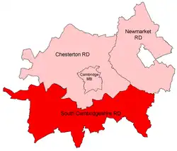 52°05′46″N 0°05′13″E / 52.096°N 0.087°E / 52.096; 0.087 South Cambridgeshire was a rural district located in Cambridgeshire, England.[1] It was established in 1934 under a County Review Order, resulting from the merger of Linton Rural District, Melbourn Rural District,[2] and part of Caxton and Arrington Rural District.[3] In 1965, it became part of the new administrative county of Cambridgeshire and the Isle of Ely. The council offices were situated at County Hall, Hobson Street, Cambridge, and the Council held its meetings at Shire Hall, Castle Hill, also in Cambridge, though both locations were outside the district. It was abolished in 1974 under the Local Government Act 1972 and merged with the Chesterton Rural District to form a new South Cambridgeshire district.[4]