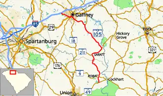 SC 105 begins at an intersection with SC 49 (Lockhart Highway) south of Robat, in rural parts of northeastern Union County. It travels to the north and almost immediately intersects SC 9 (Jonesville–Lockhart Highway). The highway gradually moves to a more westerly routing, while still traveling north. It crosses over the Pacolet River on an unnamed bridge, where it enters Cherokee County. In Saratt, it intersects SC 211 (Gowdeysville Road). The two highways travel concurrently to the east-northeast. They split in a rural area, with SC 105 traveling to the north-northwest. It goes through Wilkinsville and intersects SC 329 (Victory Trail Road). In the southern part of Gaffney, the highway begins a concurrency with SC 18 (Frederick Street) near Limestone College. The concurrency only lasts about 1,000 feet (300 m). It turns left onto Union Street, and follows that road until it meets College Drive. Then, it turns right, before turning left onto East Rutledge Avenue. It then turns left onto SC 150 (South Limestone Street). The two highways split when SC 105 turns right onto Corry Street. It then intersects U.S. Route 29 (US 29; Old Georgia Highway/South Granard Street). After a temporary departure from the city limits, where the highway passes a Freightliner plant, it meets its northern terminus, an interchange with Interstate 85. Here, the roadway continues as Hyatt Street.[3][4]