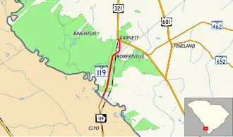 SC 119 begins at the Georgia state line, within Jasper County, where the roadway continues as Georgia State Route 119 (Railroad Avenue). It travels to the north-northeast, through rural areas of Jasper and Hampton counties and has an intersection with U.S. Route 321 (Columbia Highway) in Garnett.[3]