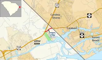 One of the shortest state highways in the state, SC 179 starts at U.S. Route 17 (US 17) in Little River and travels to the North Carolina state line. The route continues on as NC 179, connecting the towns of Calabash, Sunset Beach, Ocean Isle Beach and Shallotte. The entire route is two lanes wide with brief sections with a center turn lane.[2]