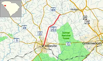 South Carolina Highway 203 (SC 203) is a 7.750-mile-long (12.472 km) state highway in the U.S. state of South Carolina. The highway connects Abbeville and rural areas of Abbeville County.