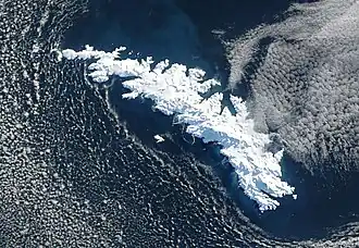 Locations currently bearing names selected by Cook include Clerke Rocks, Possession Bay, and Bay of Isles, amongst others.[19] Additional English names given many years after in recognition of past visits by American whalers in the territory include Morrell Point, Wasp Point, Pacific Point, and Comer Crag.[19] Prominent Russian-language names chosen by Bellingshausen include the Traversay Islands, Zavodovski Island, and Visokoi Island (высокий meaning "high").[19] There is also a Lowland Scots language presence within the topography of the territory, with some locations being named after notable Scottish individuals, such as Geikie Glacier[20] and Allardyce Range,[21] amongst others.[19]