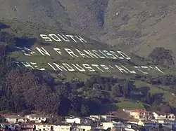 The city is particularly noted for the South San Francisco hillside sign on Sign Hill, which rises to the north of the city, with large white letters that proclaim "South San Francisco, The Industrial City". The sign, a tribute to the city's industrial past, is listed on the National Register of Historic Places.[13]