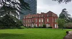 A charter dating from 990 relates to the manor of South Stoneham and during building works in the area immediately around the current house and grounds, archaeological evidence of a Saxon settlement was found.[2] The manor of South Stoneham was originally called Bishop's Stoneham, and was held by the Bishop of Winchester at the time of the Domesday Book. The original parish of South Stoneham covered more than 8,000 acres (32.37 km2; 12.50 sq mi), and extended along the eastern side of the River Itchen from the site of the present day Eastleigh in the north to just above Northam Bridge in the south, and from Swaythling to the outskirts of the original town of Southampton on the western side of the river; it included the tithings of Allington, Barton, Pollack, Shamblehurst, and Portswood. Other than St. Mary's Church (which is close to South Stoneham House but predates it considerably) and a few adjacent houses, there was no village of "South Stoneham"; the closest village to the house was Swaythling, now a suburb of Southampton.[3]