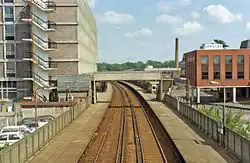Crawley was connected to the railway network in 1848 when a line was built from Three Bridges to Horsham.[14] It crossed the High Street at a level crossing at the south end of the built-up area.[12] The provision of fast, regular trains to London and other destinations stimulated residential and commercial development, especially around the station.[14] South of the line, around the Brighton Road, there was plenty of land for building; in the second half of the 19th century, two building firms—the most important in Crawley's pre-New Town history—exploited it by building two areas of housing which still exist today, forming the northernmost part of the Southgate neighbourhood.[15][16] Richard Cook set up a building firm next to the railway line soon after its completion; in the early 1870s he built some streets of mainly terraced houses west of Brighton Road. Confusingly in the context of Crawley's later history, this area was called "New Town",[17] a name which persisted for many years; it had no connection with the later establishment of the New Town of Crawley under the New Towns Act 1946, the name being merely a coincidence. Based around Springfield Road and West Street, at the junction of which was Cook's yard, the "New Town" area had 43 houses in 1875.[12][18] In the early 1880s, James Longley established his building company nearby, which by 1909 had built an estate of houses east of the Brighton Road. The roads East Park and Malthouse Road had a mixture of terraced cottages, semi-detached houses, detached houses and large villas, all built from red brick.[12][19] Large houses were also built down both sides of the Brighton Road. Goffs Park Road, between the Brighton and Horsham Roads, began to be built up in 1895, and saw more residential development in the interwar period.[12]