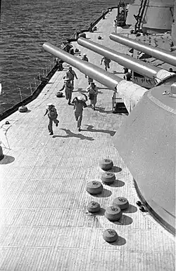 Four of Parizhskaya Kommuna's 120 mm guns were landed shortly before 22 June 1941.[12] When the Germans invaded she was in Sevastopol,[13] and she was initially kept in reserve during the Soviet attack on the Romanian port of Constanța.[14] She was evacuated to Novorossiysk on 30 October after the Germans breached Soviet defensive lines near the Perekop Isthmus. During 28–29 November she bombarded German and Romanian troops south of Sevastopol with 146 12-inch and 299 120 mm shells.[13] On 29 November, three crew were washed overboard in a storm at Sevastopol and died. They were the only crew lost during the war. Parizhskaya Kommuna ran aground but was quickly refloated.[15] She steamed into Sevastopol's South Bay on 29 December and fired 179 and 265 120 mm shells at German troops before embarking 1,025 wounded and departing in company with the cruiser Molotov on the 31st.[16] She bombarded German positions south of Feodosiya on the evening of 4–5 January 1942 and on 12 January. Parizhskaya Kommuna provided gunfire support during Soviet landings behind German lines along the southern coast of the Crimea three days later.[17] She bombarded German positions west and north of Feodosiya on the nights of 26–28 February in support of an offensive by the 44th Army. She fired her last shots of the war[16] at targets near Feodosiya during the nights of 20–22 March 1942 before returning to Poti, Georgia, to have her worn-out 12-inch guns relined.[18] By the time this was finished the Soviets were unwilling to expose such a prominent ship to German air attacks, which had already sunk a number of cruisers and destroyers.[16] She returned to her original name on 31 May 1943, but remained in Poti until late 1944 when she led the surviving major units of the Black Sea Fleet back to Sevastopol on 5 November.[16] Lend-Lease British Type 290 and 291 air-warning radars were fitted during the war.[12] She was awarded the Order of the Red Banner on 8 July 1945.[16]